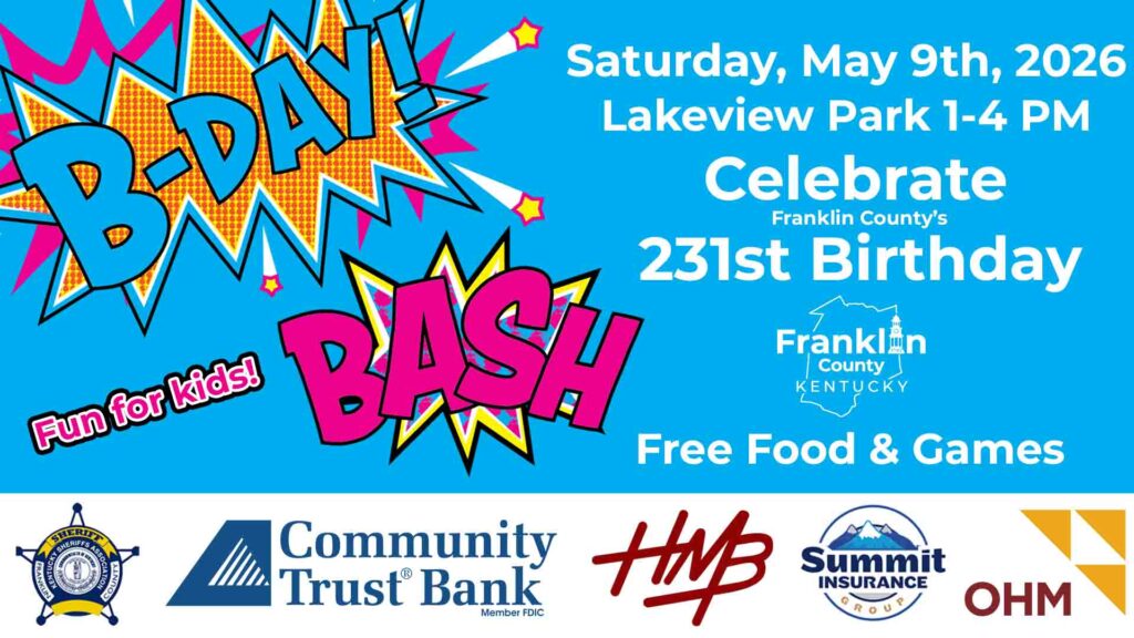 Make plans to attend Franklin County's 231st Birthday Bash at Lakeview Park. This fun, free, kid friendly event will be held on Saturday, May 9th, 2026, from 1 to 4 PM. It will feature inflatables, food, and games!