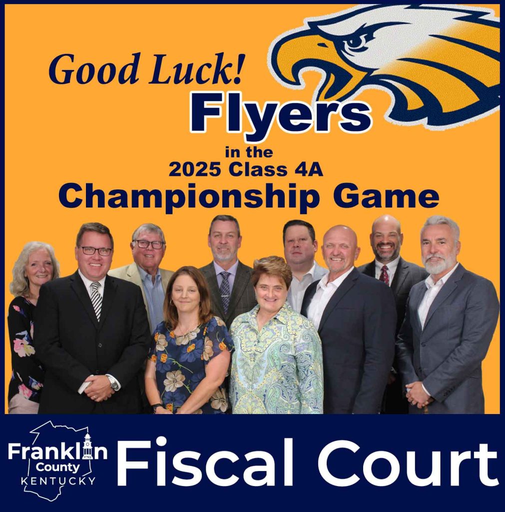 Good Luck to the Franklin County Flyers Football team tonight as they play in the 2025 Class 4A Championship game. Kickoff is at 8 PM at Kroger Field in Lexington. We encourage as many people to attend the game as possible to support our hometown athletes. Let’s go Flyers!!!